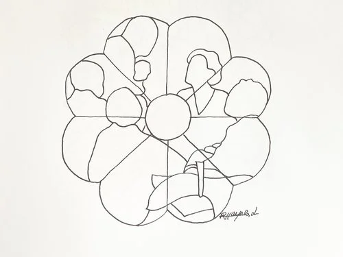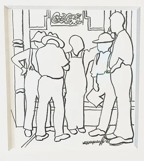 The exhibit featured two curated collections of Haynes’ work. First, The Sum of Us, included 50 black and white pen and ink sketches ranging from 1990-2022. The sketches often form the basis for larger painted pieces and show how the artistic process unfolds from start to finish. They are complex but also accessible and communicate truths about who we are as Americans and world citizens, pointing to historic moments from slavery to the Jim Crow era and beyond and featuring intimate family and community encounters with unique details in which we can all see ourselves. The title was inspired by New York Times bestselling author Heather McGhee who writes that America suffers from a zero-sum mentality, in which we presume that public goods and the good life are limited, like a pie, and lost forever if shared with others. The “sum of us” instead sees our collective prosperity is a real possibility if we recover the past and stand in solidarity. A second collection on display features 3-5 foot in diameter color circles depicting community and unity in facing some of today’s greatest challenges like racism, climate change, immigration and policing reforms, and economic inequalities, titled Our World’s Leaders in Spiritual Moral Decline.